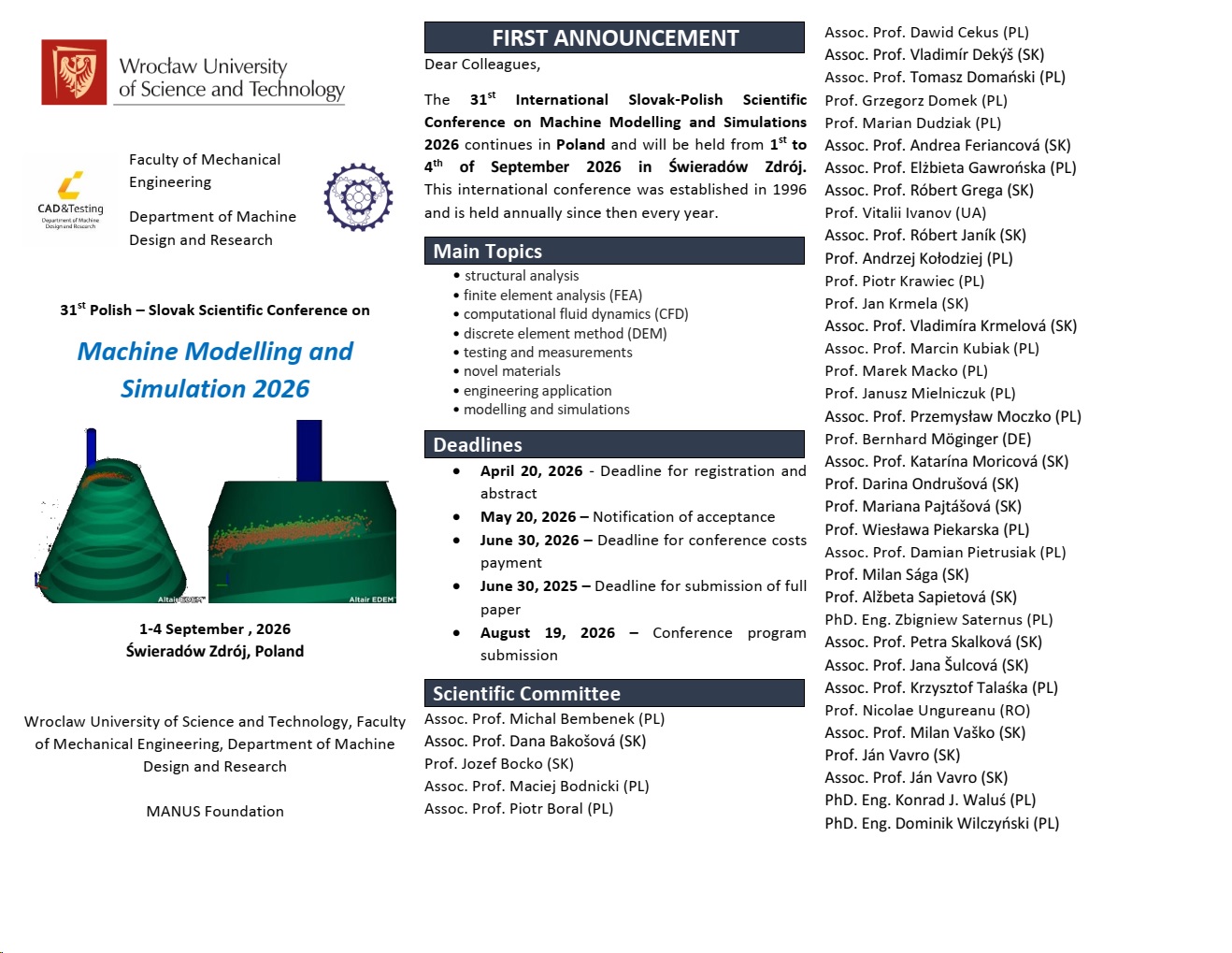 1 September, 2026 – 4 September, 202631th International Slovak-Polish Scientific Conference MACHINE MODELLING AND SIMULATIONS 2026